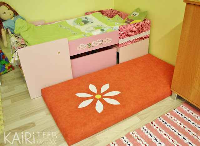 Kuna see madrats on nüüd tema toas omale sellise püsiva koha leidnud, siis otsustasin, et ka välimus võiks ju kokku sobida. Seega sai madrats uue punase katte ja kaunistuseks lilleõie ka.